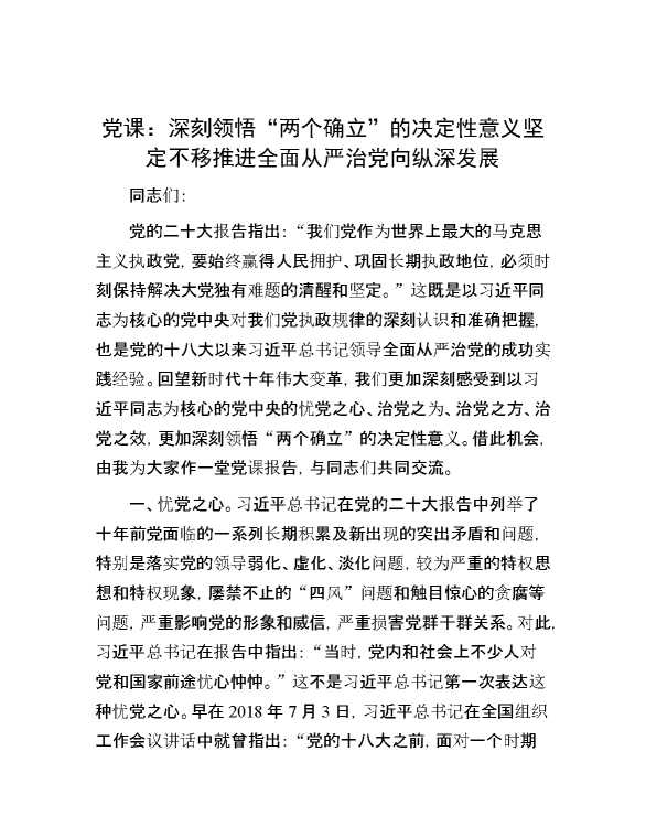 党课:深刻领悟“两个确立”的决定性意义 坚定不移推进全面从严治党向纵深发展 2024-03-24 Word模板 136 购买前,请一定要先点击这里看看,欢迎持续关注,精彩模板每天推送 预览结束,本文件为word文档,一共7页,共3257字,请购买后,下载后查看 购买前,请一定要先点击这里看看,欢迎持续关注,精彩模板每天推送 资源下载下载价格29 RMBVIP免费升级VIP点击检测网盘有效后购买有任何充值和下载问题请加微信:xuexixuexi66 0 党课及生活会