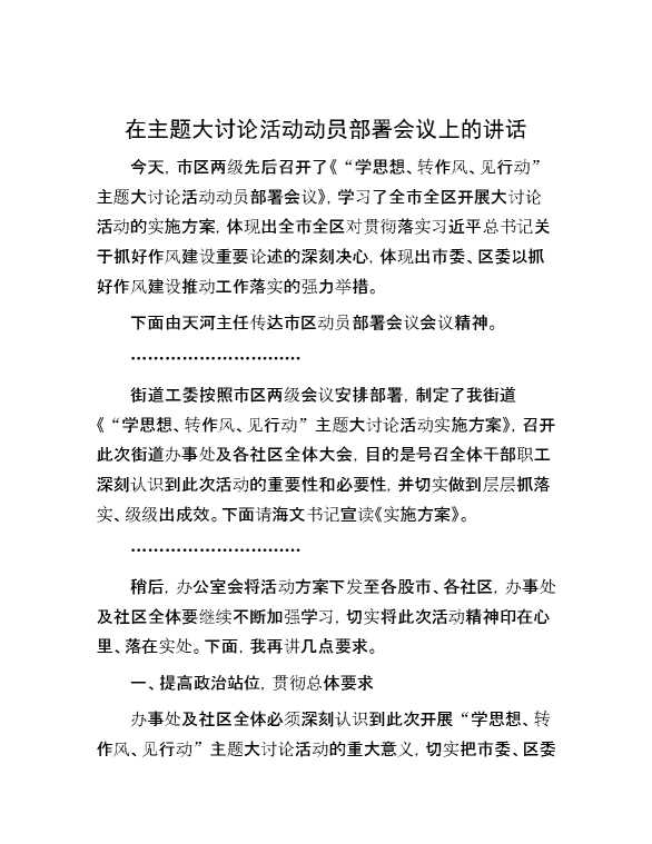 在主题大讨论活动动员部署会议上的讲话 2024-03-29 Word模板 105 购买前,请一定要先点击这里看看,欢迎持续关注,精彩模板每天推送 预览结束,本文件为word文档,一共3页,共1019字,请购买后,下载后查看 购买前,请一定要先点击这里看看,欢迎持续关注,精彩模板每天推送 资源下载下载价格29 RMBVIP免费升级VIP点击检测网盘有效后购买有任何充值和下载问题请加微信:xuexixuexi66 0 演讲发言