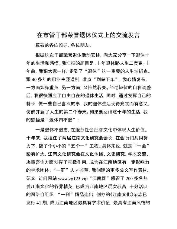 在市管干部荣誉退休仪式上的交流发言 2024-03-29 Word模板 114 购买前,请一定要先点击这里看看,欢迎持续关注,精彩模板每天推送 预览结束,本文件为word文档,一共4页,共1910字,请购买后,下载后查看 购买前,请一定要先点击这里看看,欢迎持续关注,精彩模板每天推送 资源下载下载价格29 RMBVIP免费升级VIP点击检测网盘有效后购买有任何充值和下载问题请加微信:xuexixuexi66 0 演讲发言