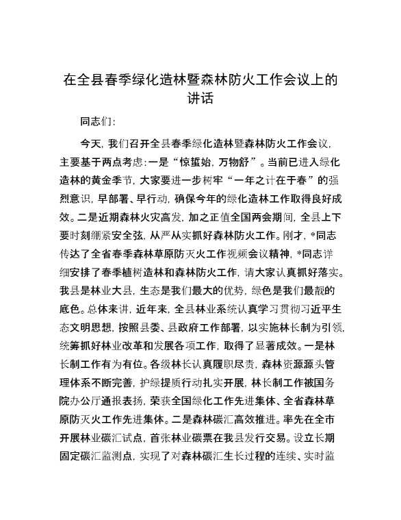 在全县春季绿化造林暨森林防火工作会议上的讲话 2024-03-29 Word模板 139 购买前,请一定要先点击这里看看,欢迎持续关注,精彩模板每天推送 预览结束,本文件为word文档,一共7页,共3127字,请购买后,下载后查看 购买前,请一定要先点击这里看看,欢迎持续关注,精彩模板每天推送 资源下载下载价格29 RMBVIP免费升级VIP点击检测网盘有效后购买有任何充值和下载问题请加微信:xuexixuexi66 0 演讲发言