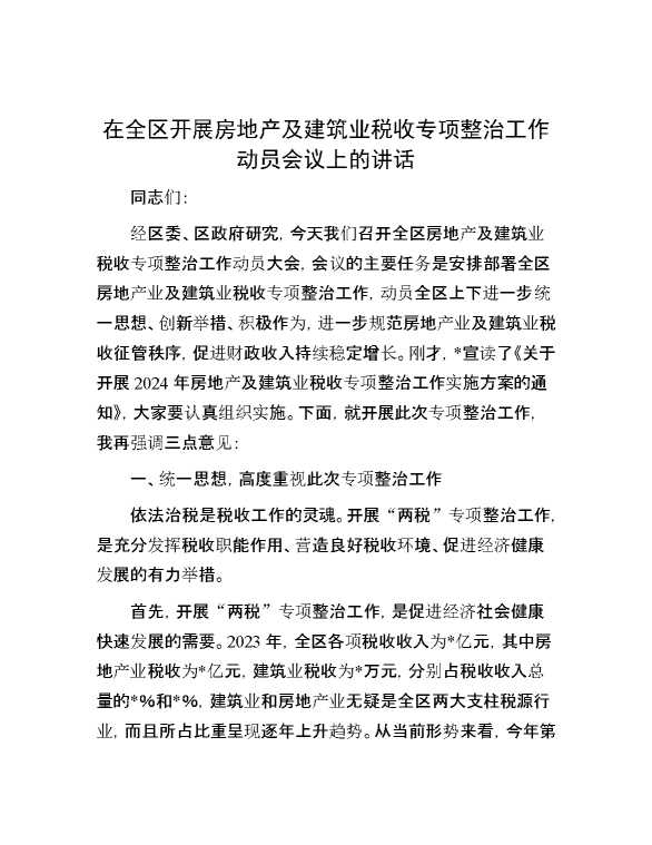 在全区开展房地产及建筑业税收专项整治工作动员会议上的讲话 2024-03-29 Word模板 121 购买前,请一定要先点击这里看看,欢迎持续关注,精彩模板每天推送 预览结束,本文件为word文档,一共6页,共2444字,请购买后,下载后查看 购买前,请一定要先点击这里看看,欢迎持续关注,精彩模板每天推送 资源下载下载价格29 RMBVIP免费升级VIP点击检测网盘有效后购买有任何充值和下载问题请加微信:xuexixuexi66 0 演讲发言
