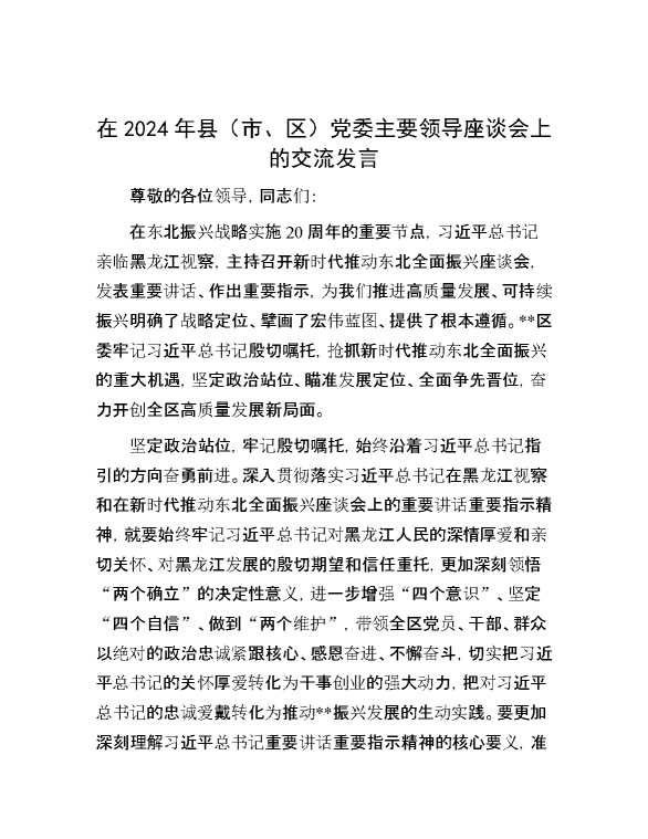 在2024年县(市、区)党委主要领导座谈会上的交流发言 2024-03-29 Word模板 114 购买前,请一定要先点击这里看看,欢迎持续关注,精彩模板每天推送 预览结束,本文件为word文档,一共7页,共3112字,请购买后,下载后查看 购买前,请一定要先点击这里看看,欢迎持续关注,精彩模板每天推送 资源下载下载价格29 RMBVIP免费升级VIP点击检测网盘有效后购买有任何充值和下载问题请加微信:xuexixuexi66 0 演讲发言
