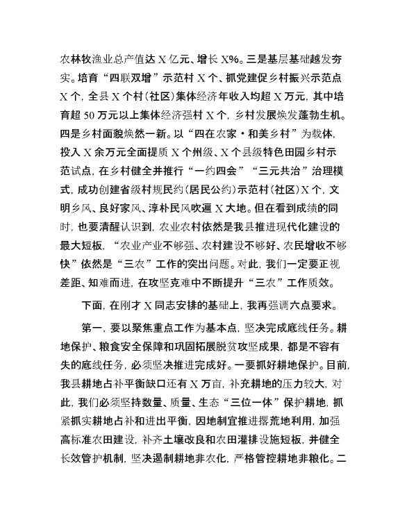 县委书记在县委农村工作会议上的讲话 2024-03-29 Word模板 115 购买前,请一定要先点击这里看看,欢迎持续关注,精彩模板每天推送 预览结束,本文件为word文档,一共11页,共5546字,请购买后,下载后查看 购买前,请一定要先点击这里看看,欢迎持续关注,精彩模板每天推送 资源下载下载价格29 RMBVIP免费升级VIP点击检测网盘有效后购买有任何充值和下载问题请加微信:xuexixuexi66 0 演讲发言