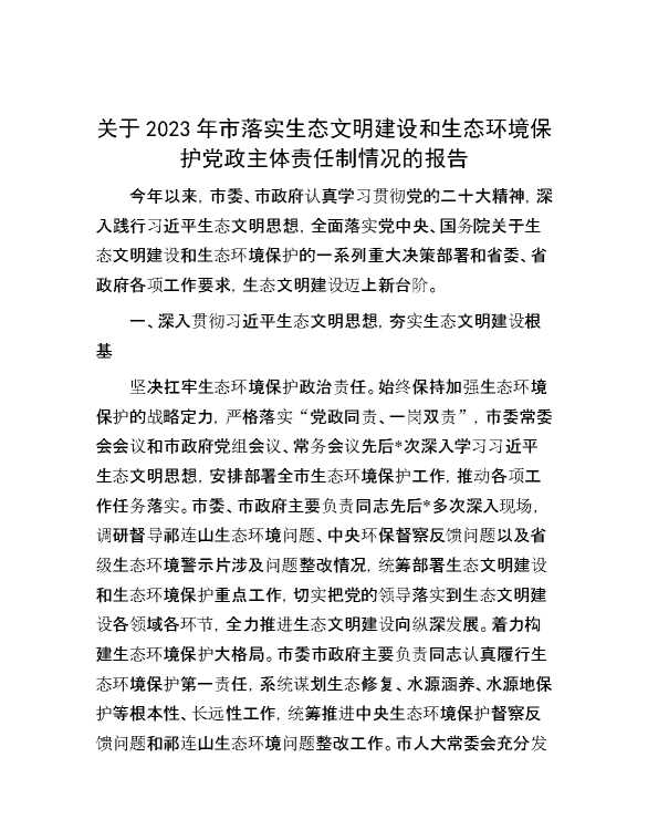 关于2023年市落实生态文明建设和生态环境保护党政主体责任制情况的报告 2024-04-01 Word模板 91 购买前,请一定要先点击这里看看,欢迎持续关注,精彩模板每天推送 预览结束,本文件为word文档,一共5页,共2385字,请购买后,下载后查看 购买前,请一定要先点击这里看看,欢迎持续关注,精彩模板每天推送 资源下载下载价格29 RMBVIP免费升级VIP点击检测网盘有效后购买有任何充值和下载问题请加微信:xuexixuexi66 0 总结汇报