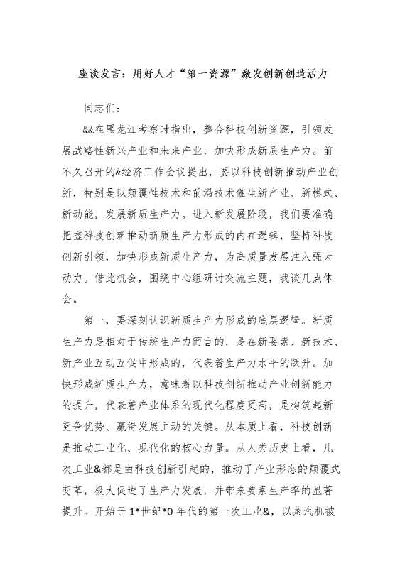 座谈发言:用好人才“第一资源”激发创新创造活力 2024-04-18 Word模板 125 购买前,请一定要先点击这里看看,欢迎持续关注,精彩模板每天推送 预览结束,本文件为word文档,一共6页,共2860字,请购买后,下载后查看 购买前,请一定要先点击这里看看,欢迎持续关注,精彩模板每天推送 资源下载下载价格29 RMBVIP免费升级VIP点击检测网盘有效后购买有任何充值和下载问题请加微信:xuexixuexi66 0 演讲发言
