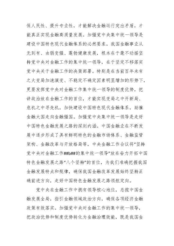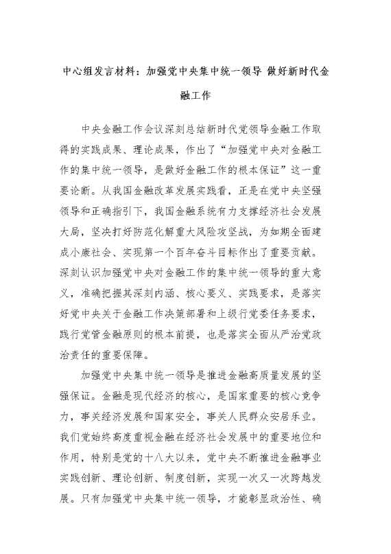 中心组发言材料:加强党中央集中统一领导 做好新时代金融工作 2024-04-18 Word模板 113 购买前,请一定要先点击这里看看,欢迎持续关注,精彩模板每天推送 预览结束,本文件为word文档,一共6页,共2588字,请购买后,下载后查看 购买前,请一定要先点击这里看看,欢迎持续关注,精彩模板每天推送 资源下载下载价格29 RMBVIP免费升级VIP点击检测网盘有效后购买有任何充值和下载问题请加微信:xuexixuexi66 0 演讲发言
