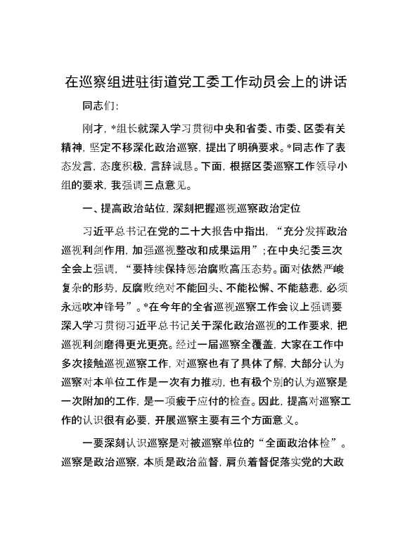 在巡察组进驻街道党工委工作动员会上的讲话 2024-04-18 Word模板 114 购买前,请一定要先点击这里看看,欢迎持续关注,精彩模板每天推送 预览结束,本文件为word文档,一共6页,共2682字,请购买后,下载后查看 购买前,请一定要先点击这里看看,欢迎持续关注,精彩模板每天推送 资源下载下载价格29 RMBVIP免费升级VIP点击检测网盘有效后购买有任何充值和下载问题请加微信:xuexixuexi66 0 演讲发言