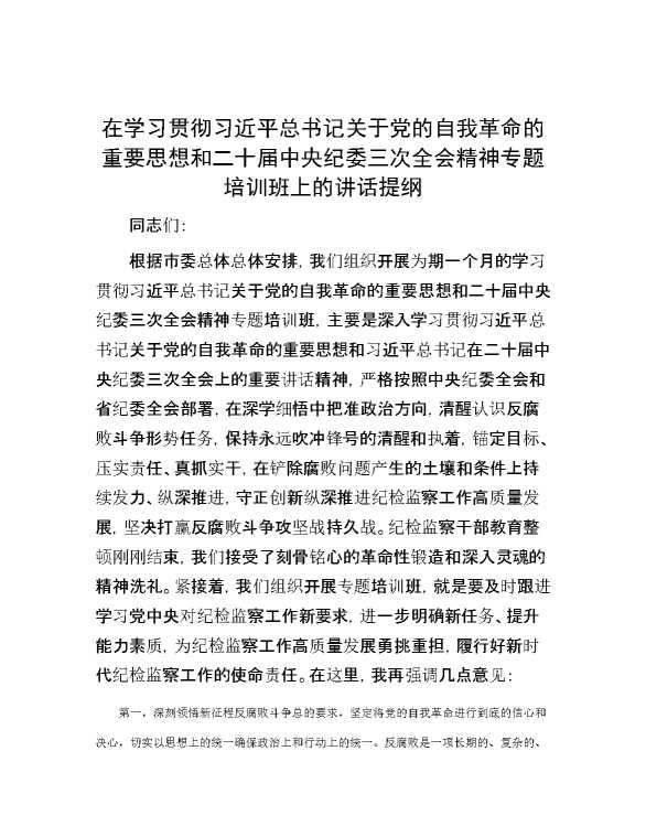 在学习贯彻习近平总书记关于党的自我革命的重要思想和二十届中央纪委三次全会精神专题培训班上的讲话提纲 2024-04-18 Word模板 126 购买前,请一定要先点击这里看看,欢迎持续关注,精彩模板每天推送 预览结束,本文件为word文档,一共7页,共3602字,请购买后,下载后查看 购买前,请一定要先点击这里看看,欢迎持续关注,精彩模板每天推送 资源下载下载价格29 RMBVIP免费升级VIP点击检测网盘有效后购买有任何充值和下载问题请加微信:xuexixuexi66 0 演讲发言