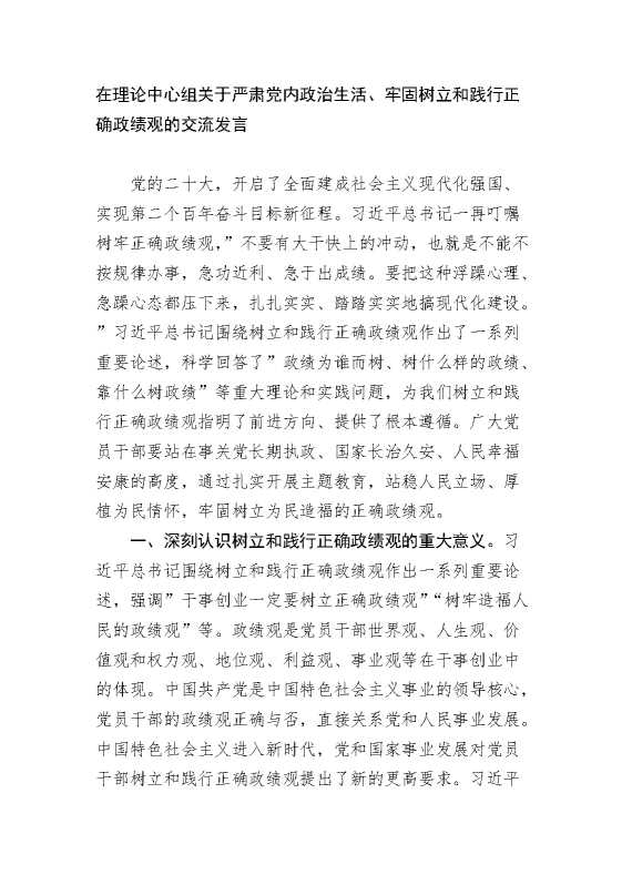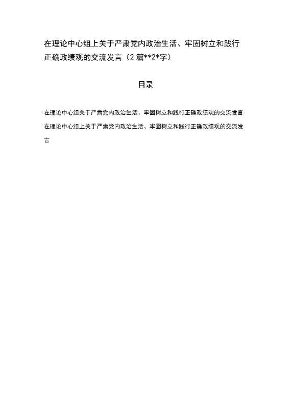 在理论中心组上关于严肃党内政治生活、牢固树立和践行正确政绩观的交流发言2篇 2024-04-18 Word模板 95 购买前,请一定要先点击这里看看,欢迎持续关注,精彩模板每天推送 预览结束,本文件为word文档,一共10页,共4396字,请购买后,下载后查看 购买前,请一定要先点击这里看看,欢迎持续关注,精彩模板每天推送 资源下载下载价格29 RMBVIP免费升级VIP点击检测网盘有效后购买有任何充值和下载问题请加微信:xuexixuexi66 0 演讲发言