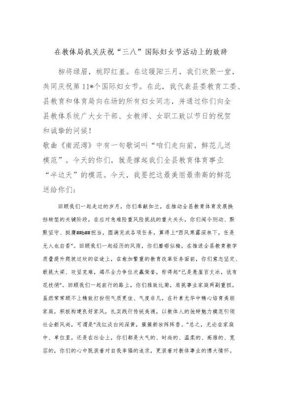 在教体局机关庆祝“三八”国际妇女节活动上的致辞 2024-04-18 Word模板 90 购买前,请一定要先点击这里看看,欢迎持续关注,精彩模板每天推送 预览结束,本文件为word文档,一共2页,共836字,请购买后,下载后查看 购买前,请一定要先点击这里看看,欢迎持续关注,精彩模板每天推送 资源下载下载价格29 RMBVIP免费升级VIP点击检测网盘有效后购买有任何充值和下载问题请加微信:xuexixuexi66 0 演讲发言