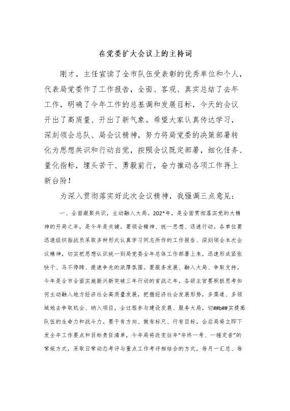 在党委扩大会议上的主持词 2024-04-18 Word模板 93 购买前,请一定要先点击这里看看,欢迎持续关注,精彩模板每天推送 预览结束,本文件为word文档,一共4页,共1447字,请购买后,下载后查看 购买前,请一定要先点击这里看看,欢迎持续关注,精彩模板每天推送 资源下载下载价格29 RMBVIP免费升级VIP点击检测网盘有效后购买有任何充值和下载问题请加微信:xuexixuexi66 0 演讲发言