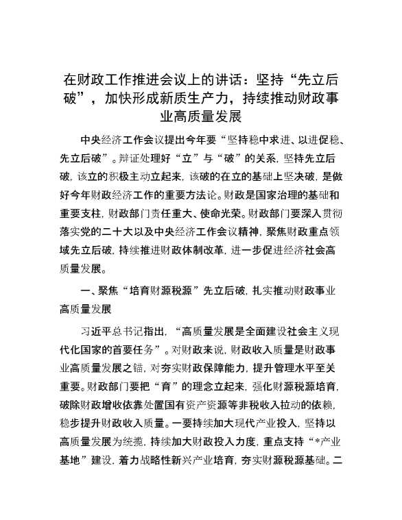 在财政工作推进会议上的讲话:坚持“先立后破”,加快形成新质生产力,持续推动财政事业高质量发展 2024-04-18 Word模板 98 购买前,请一定要先点击这里看看,欢迎持续关注,精彩模板每天推送 预览结束,本文件为word文档,一共5页,共1979字,请购买后,下载后查看 购买前,请一定要先点击这里看看,欢迎持续关注,精彩模板每天推送 资源下载下载价格29 RMBVIP免费升级VIP点击检测网盘有效后购买有任何充值和下载问题请加微信:xuexixuexi66 0 演讲发言