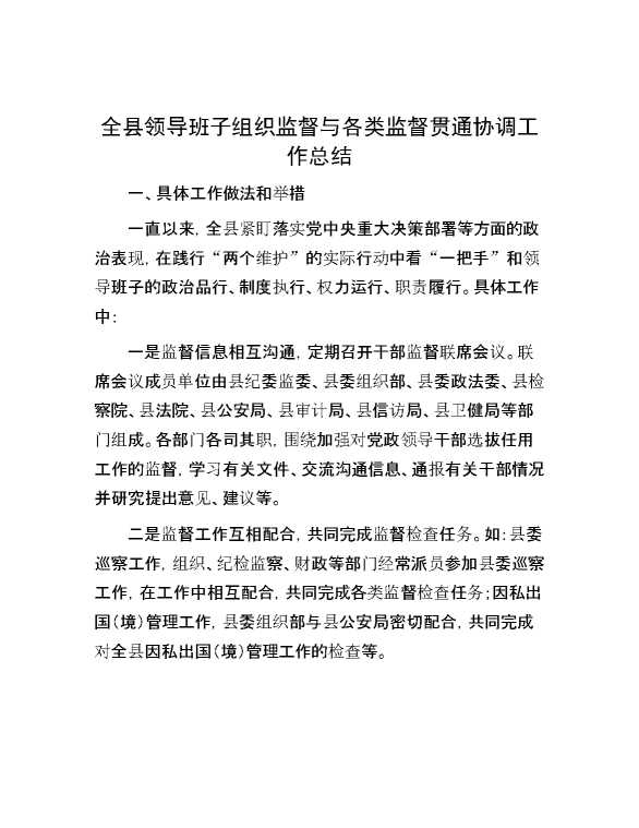 全县领导班子组织监督与各类监督贯通协调工作总结 2024-04-23 Word模板 128 购买前,请一定要先点击这里看看,欢迎持续关注,精彩模板每天推送 预览结束,本文件为word文档,一共4页,共1462字,请购买后,下载后查看 购买前,请一定要先点击这里看看,欢迎持续关注,精彩模板每天推送 资源下载下载价格29 RMBVIP免费升级VIP点击检测网盘有效后购买有任何充值和下载问题请加微信:xuexixuexi66 0 总结汇报