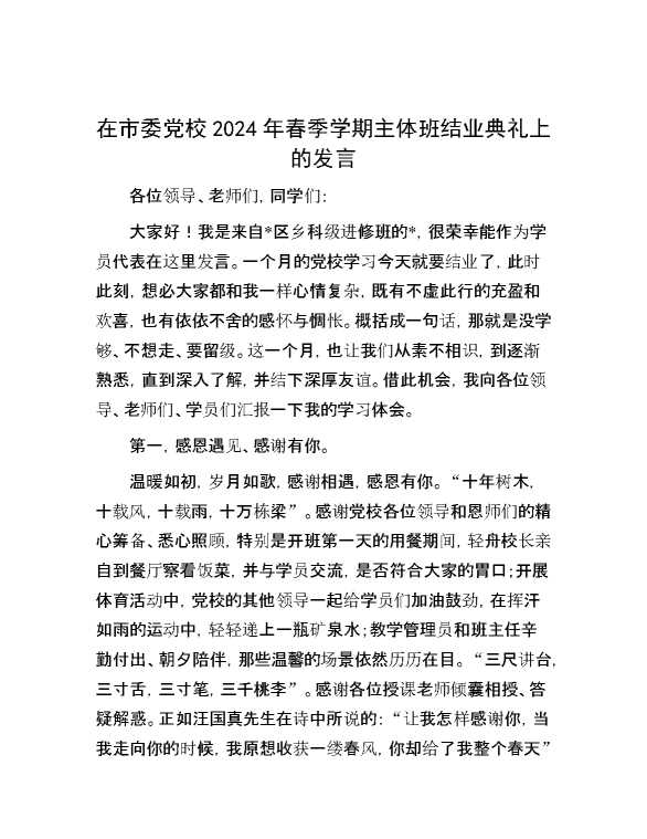在市委党校2024年春季学期主体班结业典礼上的发言 2024-04-23 Word模板 110 购买前,请一定要先点击这里看看,欢迎持续关注,精彩模板每天推送 预览结束,本文件为word文档,一共3页,共1301字,请购买后,下载后查看 购买前,请一定要先点击这里看看,欢迎持续关注,精彩模板每天推送 资源下载下载价格29 RMBVIP免费升级VIP点击检测网盘有效后购买有任何充值和下载问题请加微信:xuexixuexi66 0 演讲发言