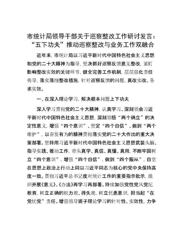 市统计局领导干部关于巡察整改工作研讨发言:“五下功夫”推动巡察整改与业务工作双融合 2024-04-23 Word模板 110 购买前,请一定要先点击这里看看,欢迎持续关注,精彩模板每天推送 预览结束,本文件为word文档,一共4页,共1544字,请购买后,下载后查看 购买前,请一定要先点击这里看看,欢迎持续关注,精彩模板每天推送 资源下载下载价格29 RMBVIP免费升级VIP点击检测网盘有效后购买有任何充值和下载问题请加微信:xuexixuexi66 0 演讲发言