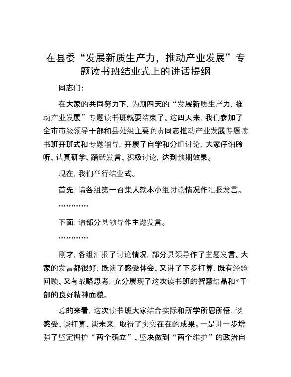 在县委“发展新质生产力,推动产业发展”专题读书班结业式上的讲话提纲 2024-04-23 Word模板 120 购买前,请一定要先点击这里看看,欢迎持续关注,精彩模板每天推送 预览结束,本文件为word文档,一共5页,共2327字,请购买后,下载后查看 购买前,请一定要先点击这里看看,欢迎持续关注,精彩模板每天推送 资源下载下载价格29 RMBVIP免费升级VIP点击检测网盘有效后购买有任何充值和下载问题请加微信:xuexixuexi66 0 演讲发言