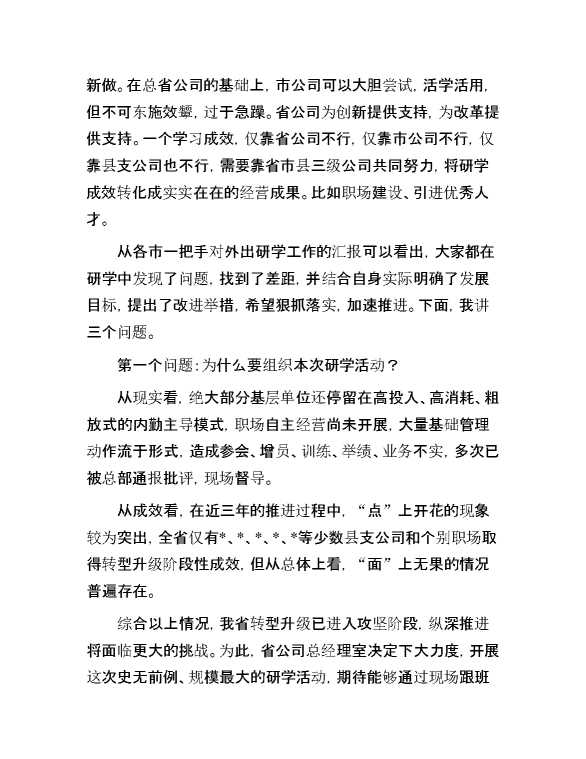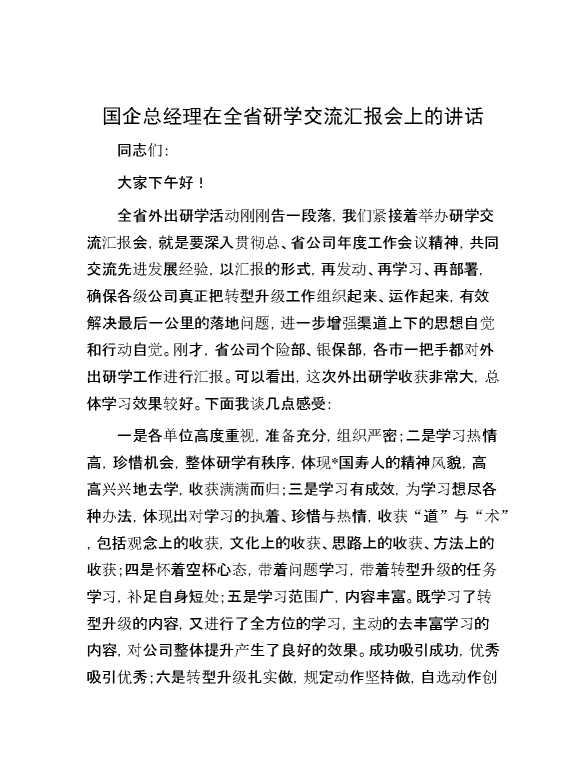 国企总经理在全省研学交流汇报会上的讲话 2024-04-23 Word模板 123 购买前,请一定要先点击这里看看,欢迎持续关注,精彩模板每天推送 预览结束,本文件为word文档,一共11页,共5274字,请购买后,下载后查看 购买前,请一定要先点击这里看看,欢迎持续关注,精彩模板每天推送 资源下载下载价格29 RMBVIP免费升级VIP点击检测网盘有效后购买有任何充值和下载问题请加微信:xuexixuexi66 0 演讲发言