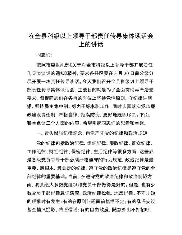 在全县科级以上领导干部责任传导集体谈话会上的讲话 2024-04-23 Word模板 96 购买前,请一定要先点击这里看看,欢迎持续关注,精彩模板每天推送 预览结束,本文件为word文档,一共8页,共3908字,请购买后,下载后查看 购买前,请一定要先点击这里看看,欢迎持续关注,精彩模板每天推送 资源下载下载价格29 RMBVIP免费升级VIP点击检测网盘有效后购买有任何充值和下载问题请加微信:xuexixuexi66 0 演讲发言