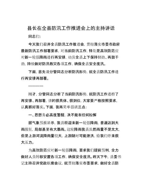 县长在全县防汛工作推进会上的主持讲话 2024-04-23 Word模板 98 购买前,请一定要先点击这里看看,欢迎持续关注,精彩模板每天推送 预览结束,本文件为word文档,一共4页,共1543字,请购买后,下载后查看 购买前,请一定要先点击这里看看,欢迎持续关注,精彩模板每天推送 资源下载下载价格29 RMBVIP免费升级VIP点击检测网盘有效后购买有任何充值和下载问题请加微信:xuexixuexi66 0 演讲发言