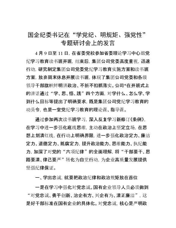 国企纪委书记在“学党纪、明规矩、强党性”专题研讨会上的发言 2024-04-27 Word模板 105 购买前,请一定要先点击这里看看,欢迎持续关注,精彩模板每天推送 预览结束,本文件为word文档,一共6页,共2495字,请购买后,下载后查看 购买前,请一定要先点击这里看看,欢迎持续关注,精彩模板每天推送 资源下载下载价格29 RMBVIP免费升级VIP点击检测网盘有效后购买有任何充值和下载问题请加微信:xuexixuexi66 0 演讲发言