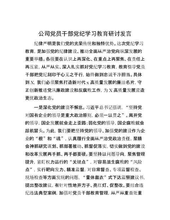 公司党员干部党纪学习教育研讨发言 2024-04-27 Word模板 125 购买前,请一定要先点击这里看看,欢迎持续关注,精彩模板每天推送 预览结束,本文件为word文档,一共3页,共1128字,请购买后,下载后查看 购买前,请一定要先点击这里看看,欢迎持续关注,精彩模板每天推送 资源下载下载价格29 RMBVIP免费升级VIP点击检测网盘有效后购买有任何充值和下载问题请加微信:xuexixuexi66 0 演讲发言