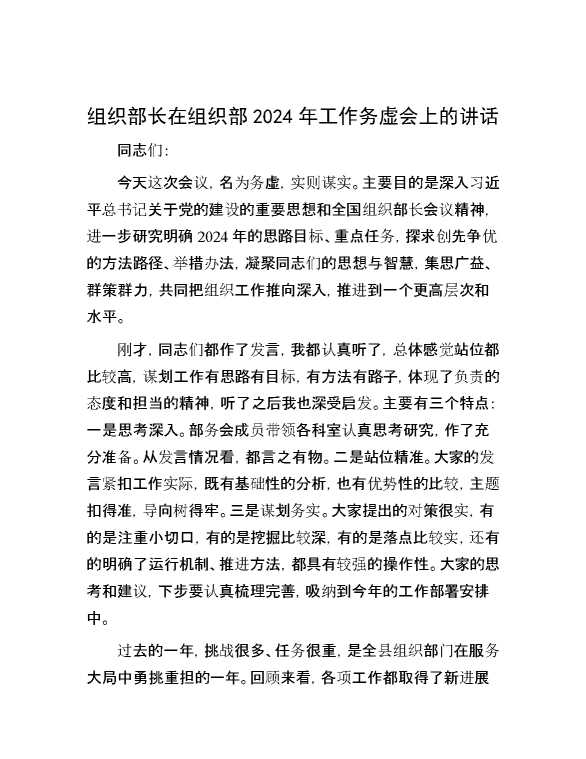 组织部长在组织部 2024 年工作务虚会上的讲话 2024-04-27 Word模板 112 购买前,请一定要先点击这里看看,欢迎持续关注,精彩模板每天推送 预览结束,本文件为word文档,一共7页,共2983字,请购买后,下载后查看 购买前,请一定要先点击这里看看,欢迎持续关注,精彩模板每天推送 资源下载下载价格29 RMBVIP免费升级VIP点击检测网盘有效后购买有任何充值和下载问题请加微信:xuexixuexi66 0 演讲发言