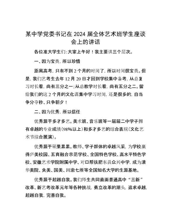 某中学党委书记在2024届全体艺术班学生座谈会上的讲话 2024-04-27 Word模板 123 购买前,请一定要先点击这里看看,欢迎持续关注,精彩模板每天推送 预览结束,本文件为word文档,一共3页,共1079字,请购买后,下载后查看 购买前,请一定要先点击这里看看,欢迎持续关注,精彩模板每天推送 资源下载下载价格29 RMBVIP免费升级VIP点击检测网盘有效后购买有任何充值和下载问题请加微信:xuexixuexi66 0 演讲发言
