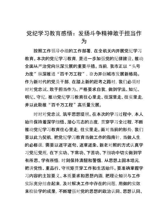 党纪学习教育感悟:发扬斗争精神 敢于担当作为 2024-05-09 Word模板 106 购买前,请一定要先点击这里看看,欢迎持续关注,精彩模板每天推送 预览结束,本文件为word文档,一共3页,共1149字,请购买后,下载后查看 购买前,请一定要先点击这里看看,欢迎持续关注,精彩模板每天推送 资源下载下载价格29 RMBVIP免费升级VIP点击检测网盘有效后购买有任何充值和下载问题请加微信:xuexixuexi66 0 党课及生活会