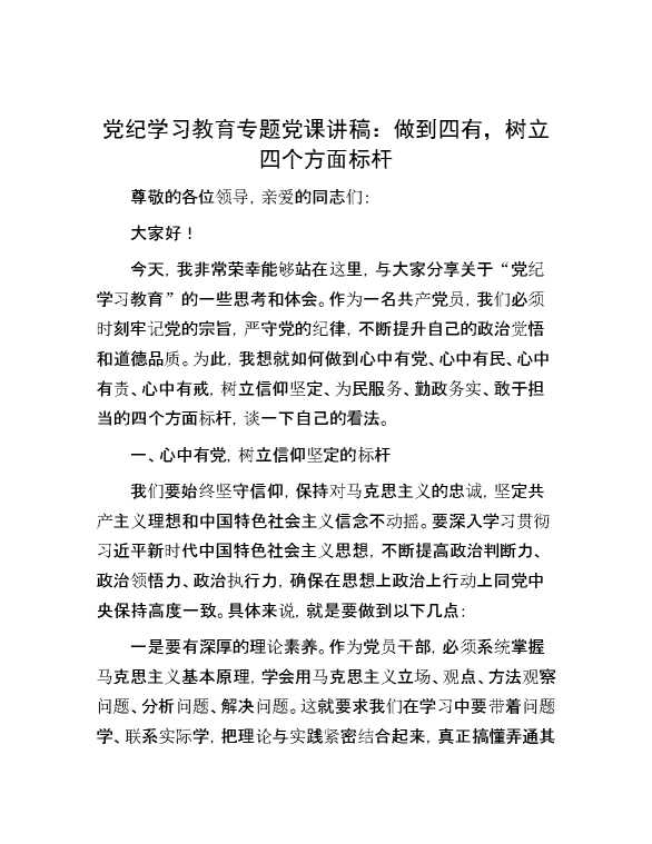 党纪学习教育专题党课讲稿:做到四有,树立四个方面标杆 2024-05-09 Word模板 141 购买前,请一定要先点击这里看看,欢迎持续关注,精彩模板每天推送 预览结束,本文件为word文档,一共4页,共1589字,请购买后,下载后查看 购买前,请一定要先点击这里看看,欢迎持续关注,精彩模板每天推送 资源下载下载价格29 RMBVIP免费升级VIP点击检测网盘有效后购买有任何充值和下载问题请加微信:xuexixuexi66 0 党课及生活会