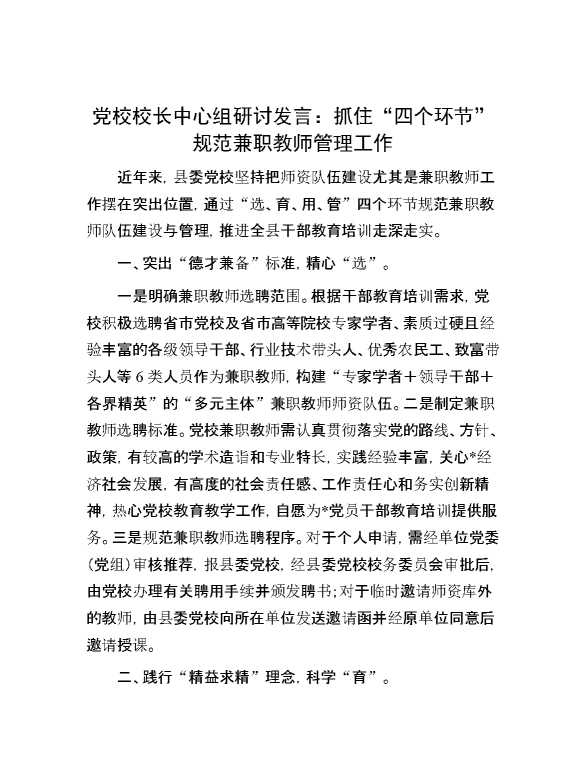 党校校长中心组研讨发言:抓住“四个环节”规范兼职教师管理工作 2024-05-12 Word模板 103 购买前,请一定要先点击这里看看,欢迎持续关注,精彩模板每天推送 预览结束,本文件为word文档,一共4页,共1559字,请购买后,下载后查看 购买前,请一定要先点击这里看看,欢迎持续关注,精彩模板每天推送 资源下载下载价格29 RMBVIP免费升级VIP点击检测网盘有效后购买有任何充值和下载问题请加微信:xuexixuexi66 0 演讲发言