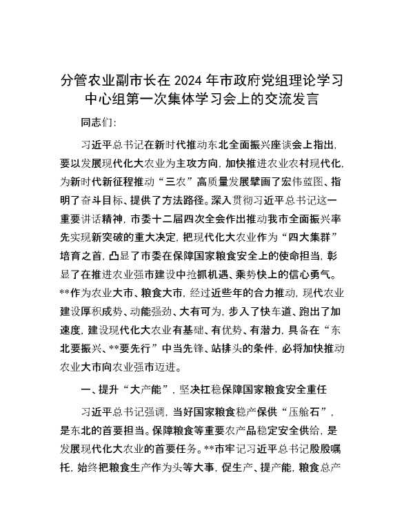 分管农业副市长在2024年市政府党组理论学习中心组第一次集体学习会上的交流发言 2024-05-12 Word模板 116 购买前,请一定要先点击这里看看,欢迎持续关注,精彩模板每天推送 预览结束,本文件为word文档,一共7页,共3422字,请购买后,下载后查看 购买前,请一定要先点击这里看看,欢迎持续关注,精彩模板每天推送 资源下载下载价格29 RMBVIP免费升级VIP点击检测网盘有效后购买有任何充值和下载问题请加微信:xuexixuexi66 0 演讲发言