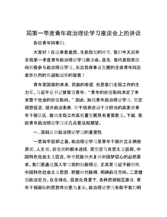 局第一季度青年政治理论学习座谈会上的讲话 2024-05-12 Word模板 118 购买前,请一定要先点击这里看看,欢迎持续关注,精彩模板每天推送 预览结束,本文件为word文档,一共4页,共1529字,请购买后,下载后查看 购买前,请一定要先点击这里看看,欢迎持续关注,精彩模板每天推送 资源下载下载价格29 RMBVIP免费升级VIP点击检测网盘有效后购买有任何充值和下载问题请加微信:xuexixuexi66 0 演讲发言