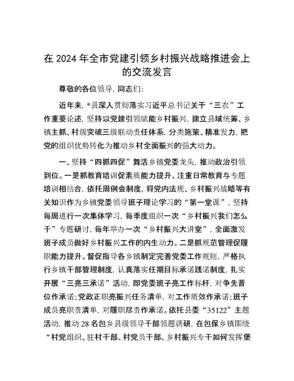在2024年全市党建引领乡村振兴战略推进会上的交流发言 2024-05-12 Word模板 108 购买前,请一定要先点击这里看看,欢迎持续关注,精彩模板每天推送 预览结束,本文件为word文档,一共4页,共1952字,请购买后,下载后查看 购买前,请一定要先点击这里看看,欢迎持续关注,精彩模板每天推送 资源下载下载价格29 RMBVIP免费升级VIP点击检测网盘有效后购买有任何充值和下载问题请加微信:xuexixuexi66 0 演讲发言