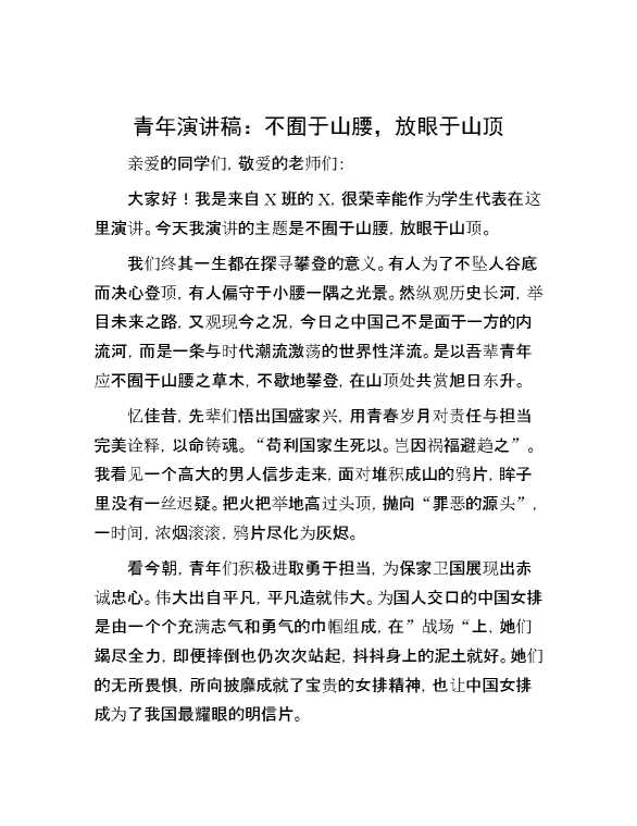 青年演讲稿:不囿于山腰,放眼于山顶 2024-05-12 Word模板 100 购买前,请一定要先点击这里看看,欢迎持续关注,精彩模板每天推送 预览结束,本文件为word文档,一共3页,共1328字,请购买后,下载后查看 购买前,请一定要先点击这里看看,欢迎持续关注,精彩模板每天推送 资源下载下载价格29 RMBVIP免费升级VIP点击检测网盘有效后购买有任何充值和下载问题请加微信:xuexixuexi66 0 演讲发言