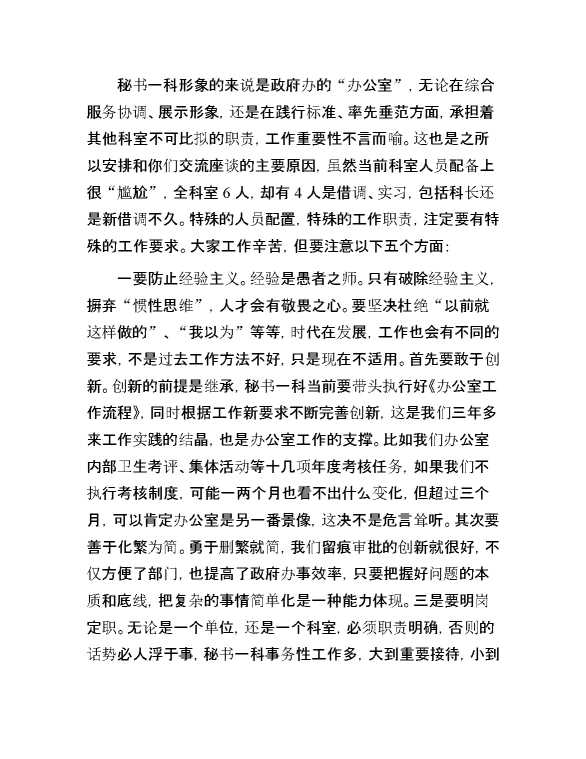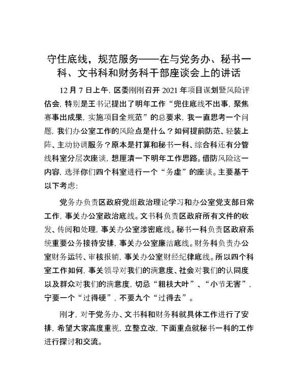 守住底线,规范服务——在与党务办、秘书一科、文书科和财务科干部座谈会上的讲话 2024-05-12 Word模板 112 购买前,请一定要先点击这里看看,欢迎持续关注,精彩模板每天推送 预览结束,本文件为word文档,一共5页,共2226字,请购买后,下载后查看 购买前,请一定要先点击这里看看,欢迎持续关注,精彩模板每天推送 资源下载下载价格29 RMBVIP免费升级VIP点击检测网盘有效后购买有任何充值和下载问题请加微信:xuexixuexi66 0 演讲发言