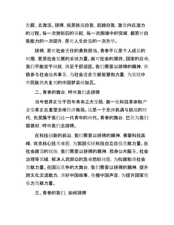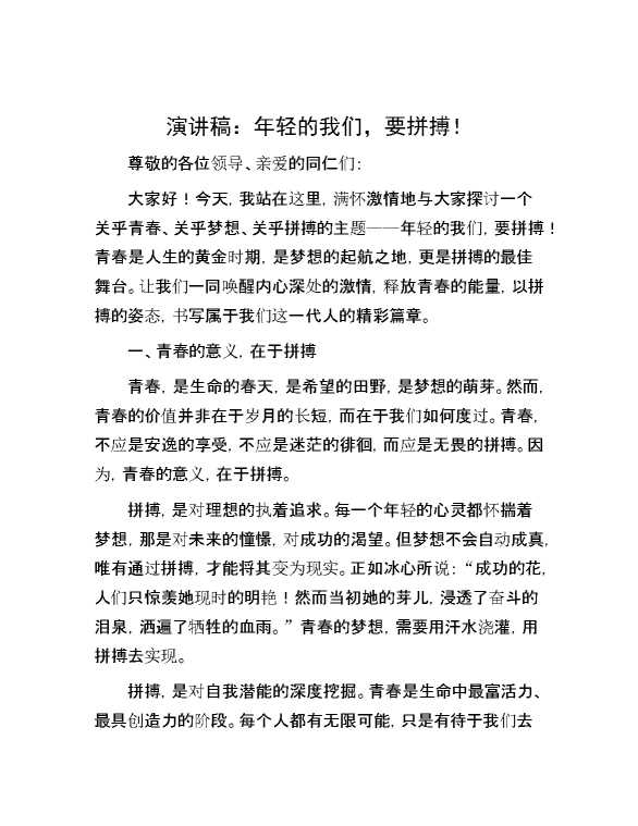 演讲稿:年轻的我们,要拼搏! 2024-05-12 Word模板 108 购买前,请一定要先点击这里看看,欢迎持续关注,精彩模板每天推送 预览结束,本文件为word文档,一共4页,共1331字,请购买后,下载后查看 购买前,请一定要先点击这里看看,欢迎持续关注,精彩模板每天推送 资源下载下载价格29 RMBVIP免费升级VIP点击检测网盘有效后购买有任何充值和下载问题请加微信:xuexixuexi66 0 演讲发言