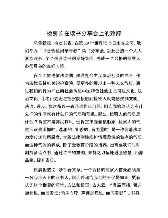 检察长在读书分享会上的致辞 2024-05-12 Word模板 107 购买前,请一定要先点击这里看看,欢迎持续关注,精彩模板每天推送 预览结束,本文件为word文档,一共4页,共1862字,请购买后,下载后查看 购买前,请一定要先点击这里看看,欢迎持续关注,精彩模板每天推送 资源下载下载价格29 RMBVIP免费升级VIP点击检测网盘有效后购买有任何充值和下载问题请加微信:xuexixuexi66 0 演讲发言