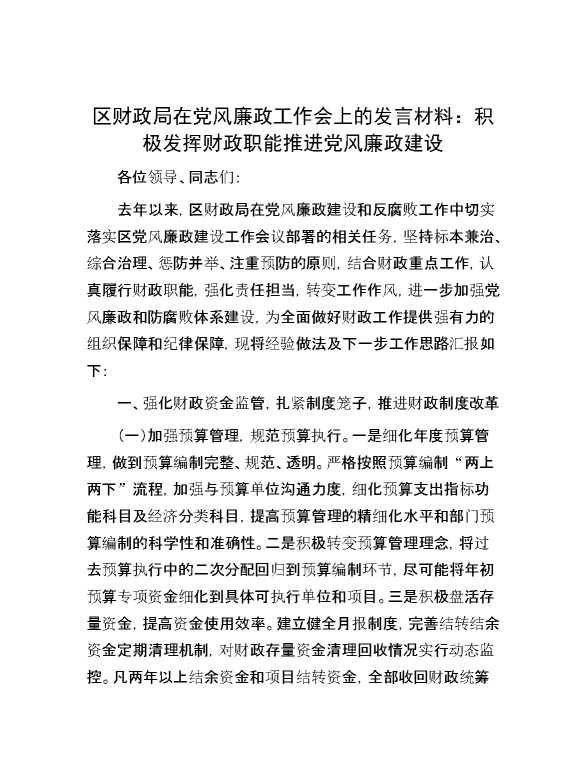 区财政局在党风廉政工作会上的发言材料:积极发挥财政职能 推进党风廉政建设 2024-05-12 Word模板 114 购买前,请一定要先点击这里看看,欢迎持续关注,精彩模板每天推送 预览结束,本文件为word文档,一共5页,共2204字,请购买后,下载后查看 购买前,请一定要先点击这里看看,欢迎持续关注,精彩模板每天推送 资源下载下载价格29 RMBVIP免费升级VIP点击检测网盘有效后购买有任何充值和下载问题请加微信:xuexixuexi66 0 演讲发言
