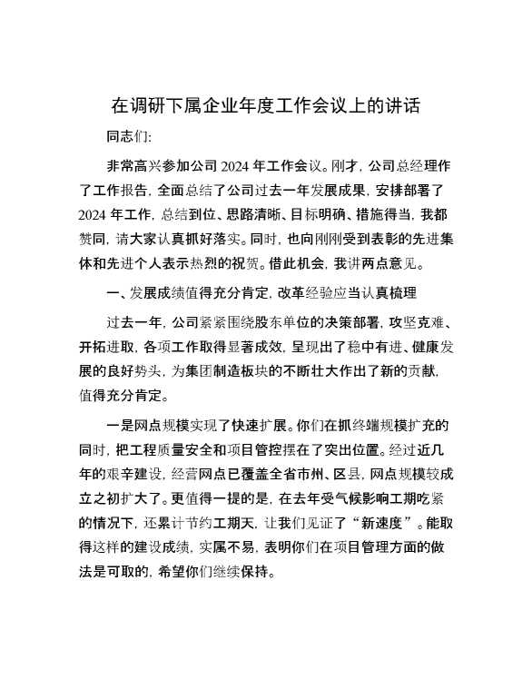 在调研下属企业年度工作会议上的讲话 2024-05-12 Word模板 126 购买前,请一定要先点击这里看看,欢迎持续关注,精彩模板每天推送 预览结束,本文件为word文档,一共6页,共2482字,请购买后,下载后查看 购买前,请一定要先点击这里看看,欢迎持续关注,精彩模板每天推送 资源下载下载价格29 RMBVIP免费升级VIP点击检测网盘有效后购买有任何充值和下载问题请加微信:xuexixuexi66 0 演讲发言