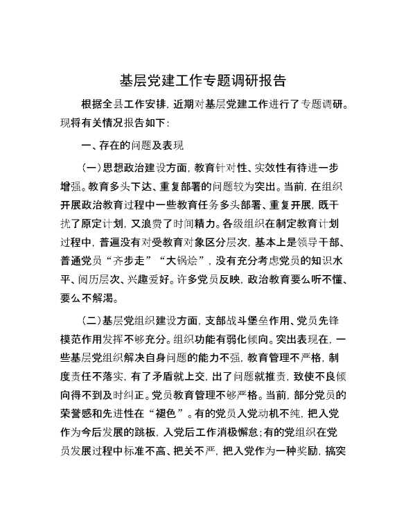 基层党建工作专题调研报告 2024-05-15 Word模板 97 购买前,请一定要先点击这里看看,欢迎持续关注,精彩模板每天推送 预览结束,本文件为word文档,一共4页,共1687字,请购买后,下载后查看 购买前,请一定要先点击这里看看,欢迎持续关注,精彩模板每天推送 资源下载下载价格29 RMBVIP免费升级VIP点击检测网盘有效后购买有任何充值和下载问题请加微信:xuexixuexi66 0 总结汇报
