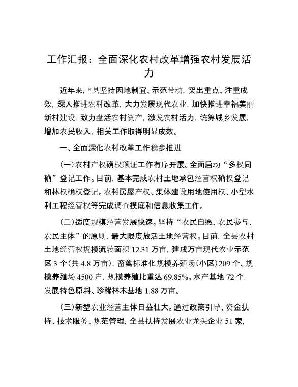工作汇报:全面深化农村改革 增强农村发展活力 2024-05-15 Word模板 129 购买前,请一定要先点击这里看看,欢迎持续关注,精彩模板每天推送 预览结束,本文件为word文档,一共4页,共1443字,请购买后,下载后查看 购买前,请一定要先点击这里看看,欢迎持续关注,精彩模板每天推送 资源下载下载价格29 RMBVIP免费升级VIP点击检测网盘有效后购买有任何充值和下载问题请加微信:xuexixuexi66 0 总结汇报