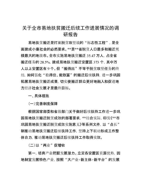 关于全市易地扶贫搬迁后续工作进展情况的调研报告 2024-05-15 Word模板 118 购买前,请一定要先点击这里看看,欢迎持续关注,精彩模板每天推送 预览结束,本文件为word文档,一共9页,共4097字,请购买后,下载后查看 购买前,请一定要先点击这里看看,欢迎持续关注,精彩模板每天推送 资源下载下载价格29 RMBVIP免费升级VIP点击检测网盘有效后购买有任何充值和下载问题请加微信:xuexixuexi66 0 总结汇报