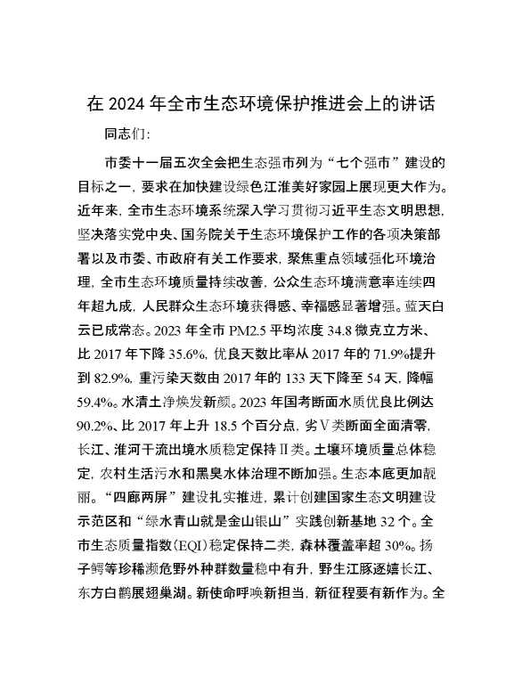 在2024年全市生态环境保护推进会上的讲话 2024-05-19 Word模板 118 购买前,请一定要先点击这里看看,欢迎持续关注,精彩模板每天推送 预览结束,本文件为word文档,一共7页,共3575字,请购买后,下载后查看 购买前,请一定要先点击这里看看,欢迎持续关注,精彩模板每天推送 资源下载下载价格29 RMBVIP免费升级VIP点击检测网盘有效后购买有任何充值和下载问题请加微信:xuexixuexi66 0 演讲发言