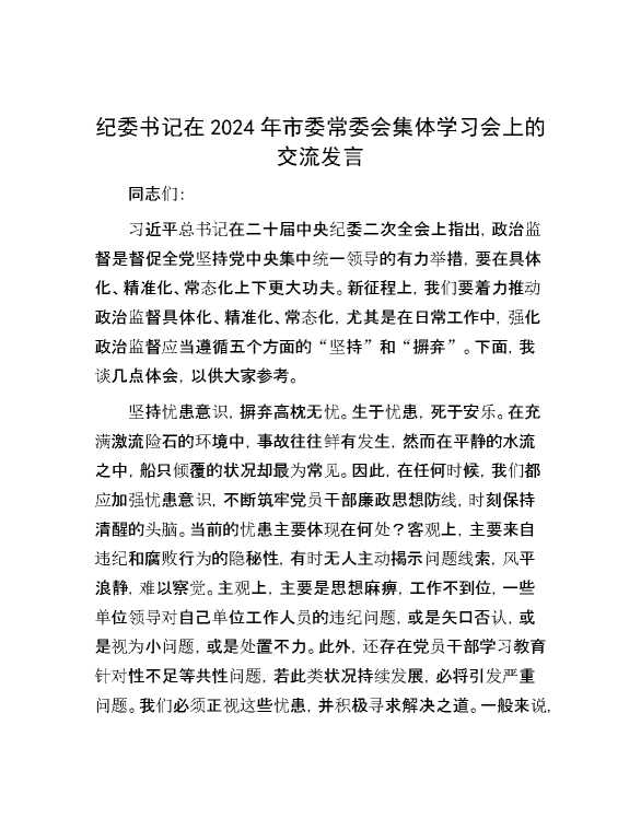 纪委书记在2024年市委常委会集体学习会上的交流发言 2024-05-19 Word模板 105 购买前,请一定要先点击这里看看,欢迎持续关注,精彩模板每天推送 预览结束,本文件为word文档,一共4页,共1623字,请购买后,下载后查看 购买前,请一定要先点击这里看看,欢迎持续关注,精彩模板每天推送 资源下载下载价格29 RMBVIP免费升级VIP点击检测网盘有效后购买有任何充值和下载问题请加微信:xuexixuexi66 0 演讲发言