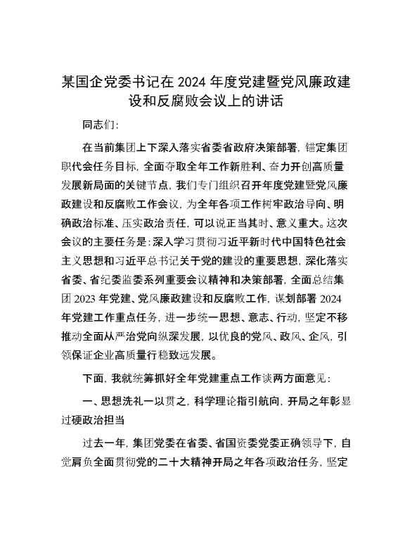 某国企党委书记在2024年度党建暨党风廉政建设和反腐败会议上的讲话 2024-05-19 Word模板 113 购买前,请一定要先点击这里看看,欢迎持续关注,精彩模板每天推送 预览结束,本文件为word文档,一共9页,共4416字,请购买后,下载后查看 购买前,请一定要先点击这里看看,欢迎持续关注,精彩模板每天推送 资源下载下载价格29 RMBVIP免费升级VIP点击检测网盘有效后购买有任何充值和下载问题请加微信:xuexixuexi66 0 演讲发言