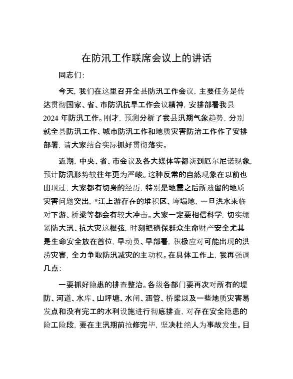 在防汛工作联席会议上的讲话 2024-05-19 Word模板 120 购买前,请一定要先点击这里看看,欢迎持续关注,精彩模板每天推送 预览结束,本文件为word文档,一共3页,共1171字,请购买后,下载后查看 购买前,请一定要先点击这里看看,欢迎持续关注,精彩模板每天推送 资源下载下载价格29 RMBVIP免费升级VIP点击检测网盘有效后购买有任何充值和下载问题请加微信:xuexixuexi66 0 演讲发言