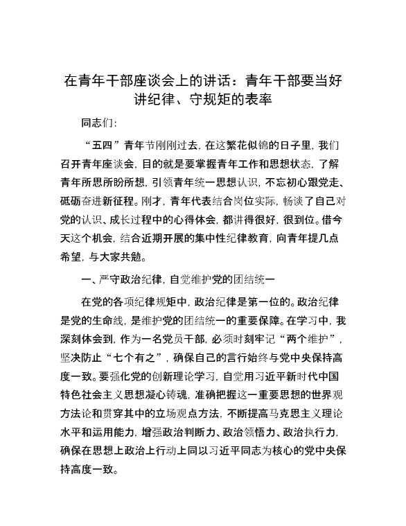 在青年干部座谈会上的讲话:青年干部要当好讲纪律、守规矩的表率 2024-05-19 Word模板 109 购买前,请一定要先点击这里看看,欢迎持续关注,精彩模板每天推送 预览结束,本文件为word文档,一共4页,共1680字,请购买后,下载后查看 购买前,请一定要先点击这里看看,欢迎持续关注,精彩模板每天推送 资源下载下载价格29 RMBVIP免费升级VIP点击检测网盘有效后购买有任何充值和下载问题请加微信:xuexixuexi66 0 演讲发言