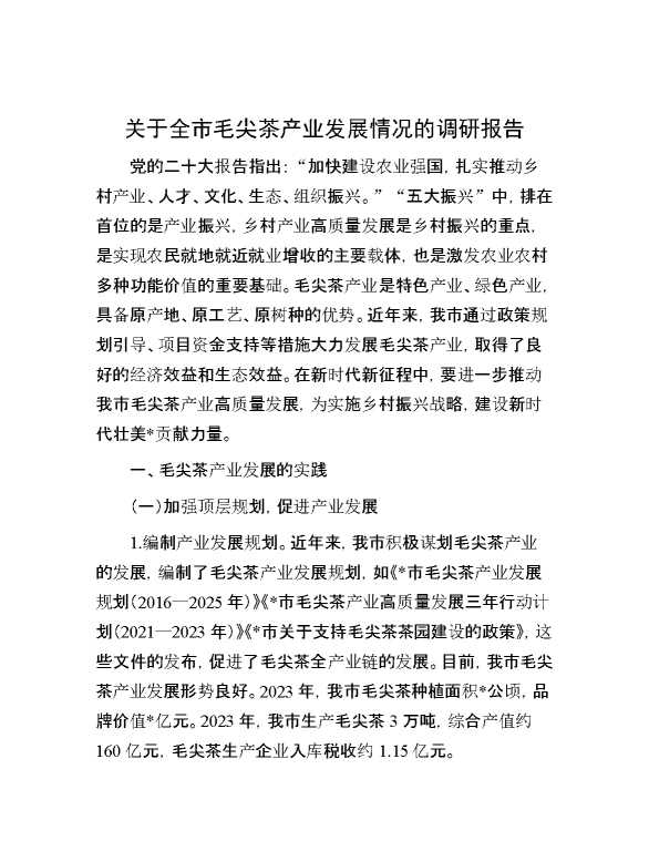 关于全市毛尖茶产业发展情况的调研报告 2024-05-23 Word模板 90 购买前,请一定要先点击这里看看,欢迎持续关注,精彩模板每天推送 预览结束,本文件为word文档,一共10页,共4597字,请购买后,下载后查看 购买前,请一定要先点击这里看看,欢迎持续关注,精彩模板每天推送 资源下载下载价格29 RMBVIP免费升级VIP点击检测网盘有效后购买有任何充值和下载问题请加微信:xuexixuexi66 0 总结汇报