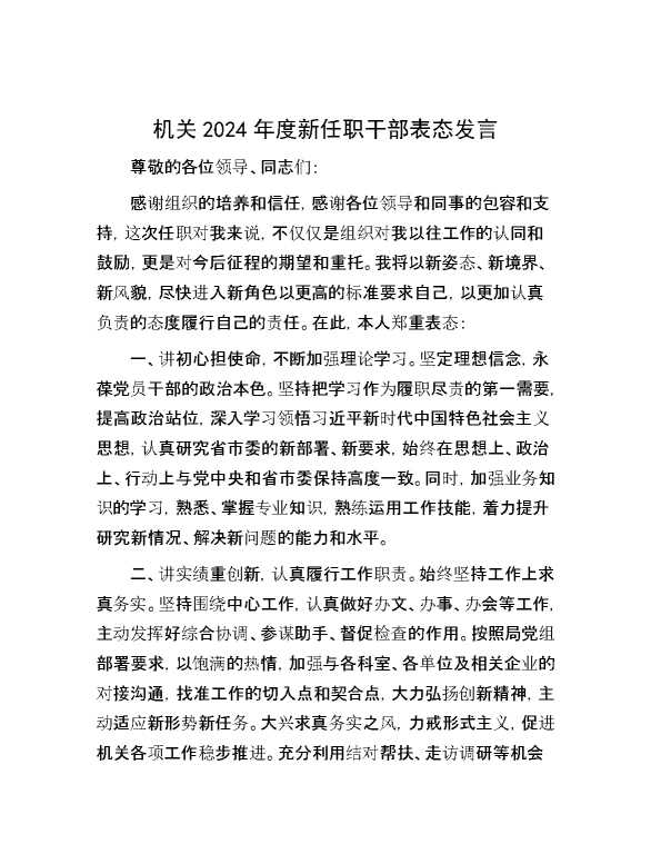 机关2024年度新任职干部表态发言 2024-05-23 Word模板 125 购买前,请一定要先点击这里看看,欢迎持续关注,精彩模板每天推送 预览结束,本文件为word文档,一共2页,共902字,请购买后,下载后查看 购买前,请一定要先点击这里看看,欢迎持续关注,精彩模板每天推送 资源下载下载价格29 RMBVIP免费升级VIP点击检测网盘有效后购买有任何充值和下载问题请加微信:xuexixuexi66 0 演讲发言