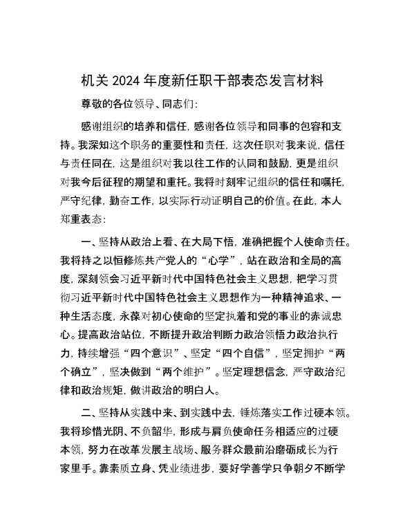 机关2024年度新任职干部表态发言材料【31818】 2024-05-23 Word模板 133 购买前,请一定要先点击这里看看,欢迎持续关注,精彩模板每天推送 预览结束,本文件为word文档,一共2页,共827字,请购买后,下载后查看 购买前,请一定要先点击这里看看,欢迎持续关注,精彩模板每天推送 资源下载下载价格29 RMBVIP免费升级VIP点击检测网盘有效后购买有任何充值和下载问题请加微信:xuexixuexi66 0 演讲发言